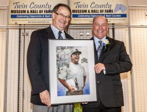 Lanny Shuff left, and Sam Toler hold Toler’s portrait during the Twin County Hall of Fame Induction Banquet at the Rocky Mount Event Center.