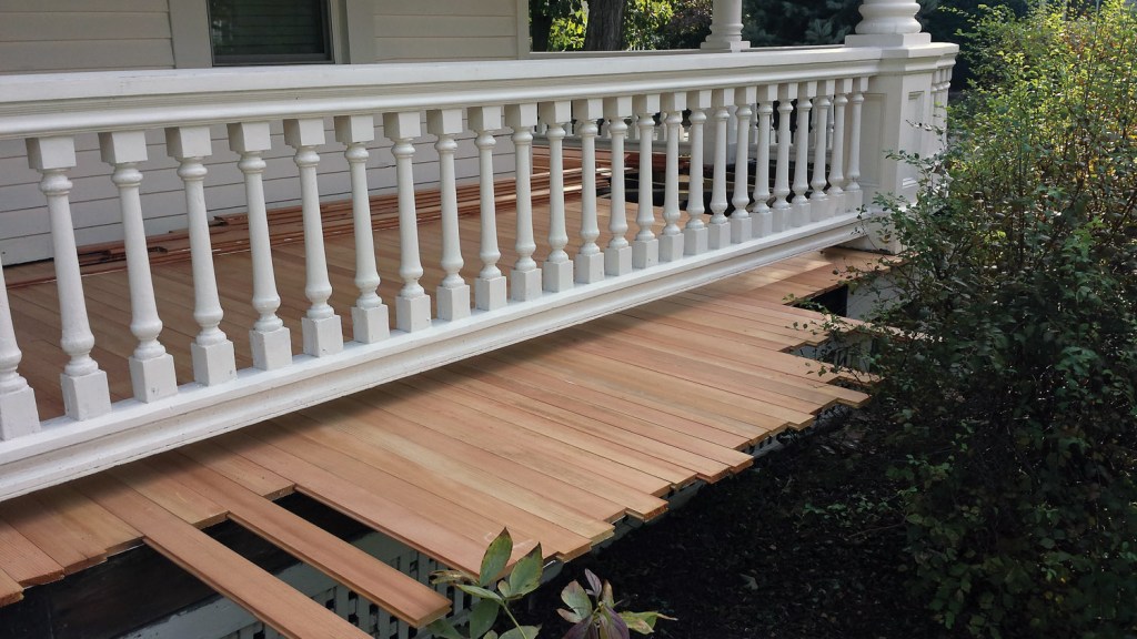 Historically, porch deck boards were milled from Douglas fir, cedar, or other rot-resistant wood. Once planed and sanded, boards were a standard 7/8″ thick.