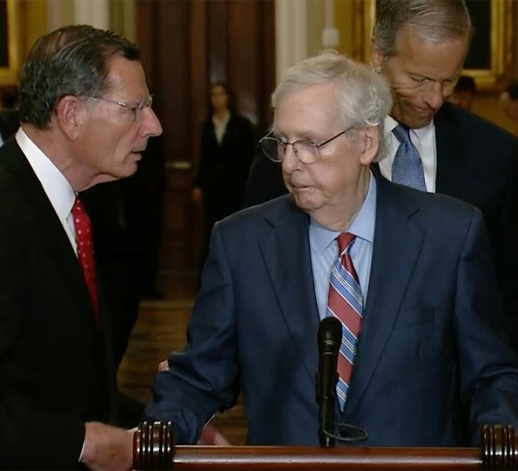 WASHINGTON — Senate Republican Leader Mitch McConnell briefly left his own press conference Wednesday after stopping his remarks mid-sentence and staring off into space for several seconds. McConnell approached the podium for his weekly press conference and began speaking about the annual defense bill on the floor, which he said was proceeding with “good bipartisan cooperation.” The Kentucky senator then appeared to freeze up and stared vacantly for around 20 seconds before his colleague in Republican leadership, who were standing behind him grabbed his elbows and asked if he wanted to go back to his office. Wyoming Sen. John Barrasso, a former orthopedic surgeon who is the No. 3 Republican in the Senate, gently took the situation in hand and helped the Senator leave the podium. The Senator later returned and answered questions.
