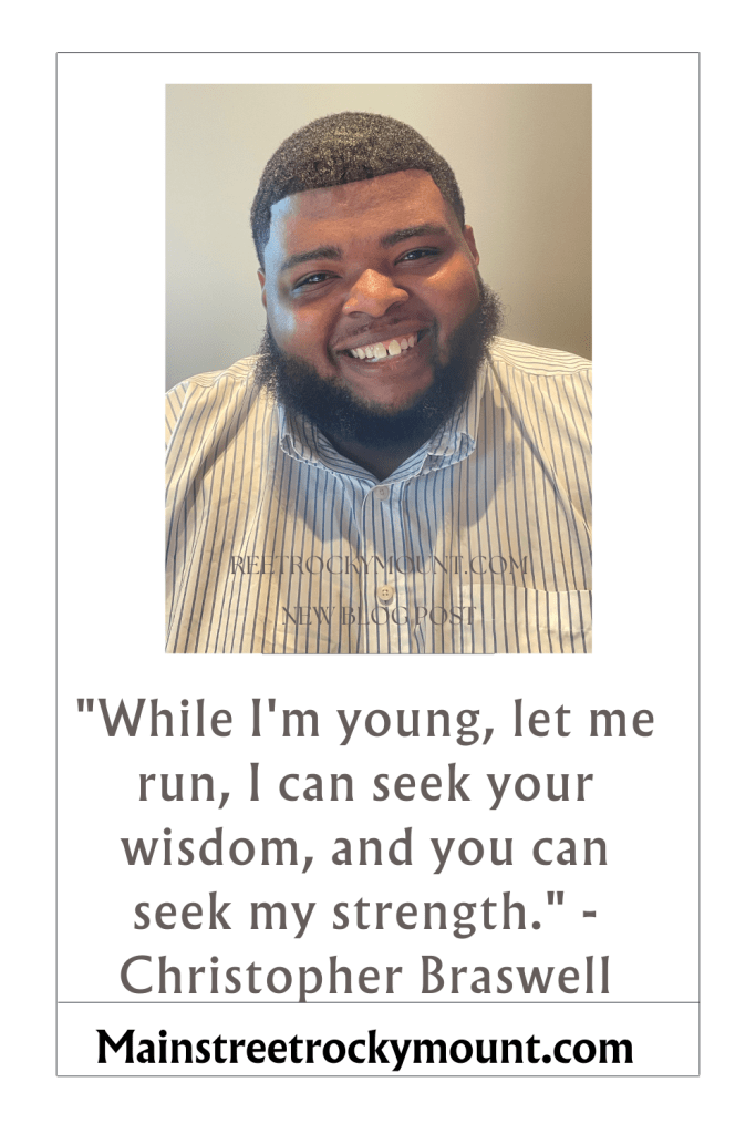 His mother, Montrell, has told him through the years, “Go higher than your hands can reach.” Here is one example of Christopher following that admonition. He wants to acquire a shotgun house near downtown Rocky Mount. He will have to apply for a grant that justifies restoring the house to help homeless people. This will not only be a place a person can have a shower, but where they can be connected to resources for help. He will have to reach out to the community to support these efforts with a contribution of money or using personal skills in the restoration and repurposing on one of our shot gun houses. I love the proposed name, Braswell Transitional Home.