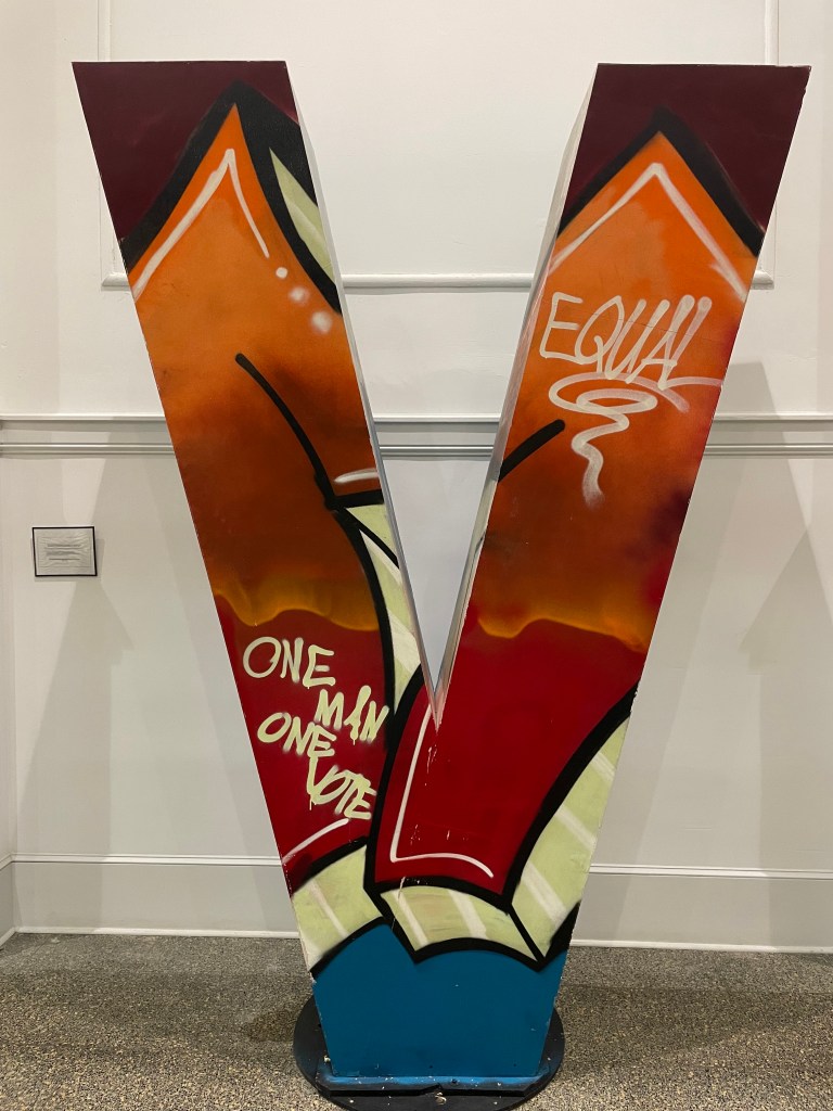 Encouraging voting with persuasive reasons is on the minds of artists and mayors. This sculpture is on display in the Kress Building, Montgomery, Alabama. This can be seen at the Equal Justice Initiative, an organization that works with communities marginalized by poverty. V-O-T-E was commissioned by Montgomery’s mayor for the celebration of the 50th anniversary of the Selma to Montgomery march. Each ten-foot sculpted letter injects symbolism into a movement that expanded voting rights.