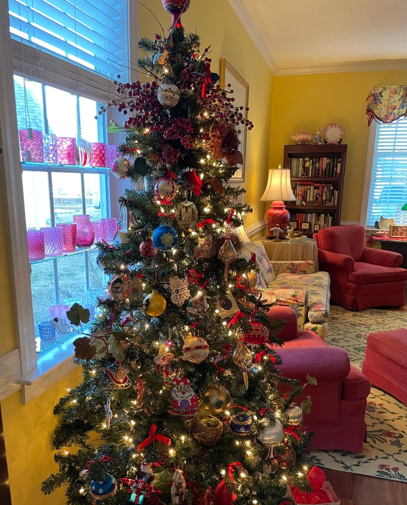 Each year when I return from a mountain Thanksgiving, I anticipate my neighbors on either side to have worked their magic. Once again the hours of work produced a beautiful sight. I will enjoy this gift of light each evening. Below I’m sharing my tree with you from last year because this year it’s going to be a tree I have enjoyed all year. You’ll see.