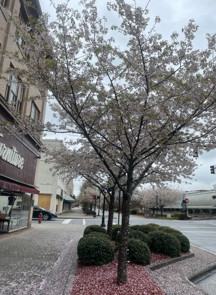 This may be my favorite photo from being downtown today. A train came by that is an iconic image of Rocky Mount. You can see the edge of one of the benches in place along Main Street. The wind swirled the cherry blossoms that looked like confetti. Each petal not only represents the renewal and hope of Spring, but is a lovely metaphor for the revitalization of Main Street.