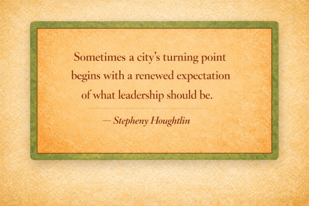 This is what feels absent today, the moral clarity that guides a city toward something better than the familiar patterns of disappointment, self-serving shenanigans, and a rigged system.